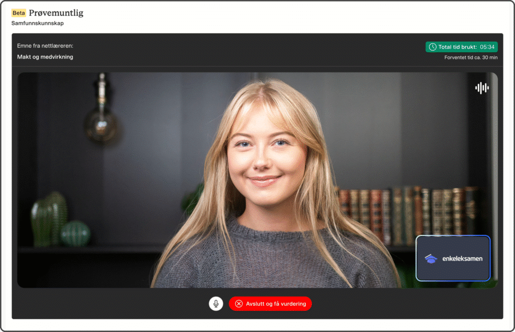 For å gjøre det bra på muntlig eksamen må du ikke bare kunne stoffet, men også vise at du kan reflektere, trekke sammenhenger og forklare det tydelig. Med vår AI-prøvemuntlig får du realistisk trening med et verktøy som lar deg øve på muntlig eksamen så mye du vil, når du vil, helt uten stress.