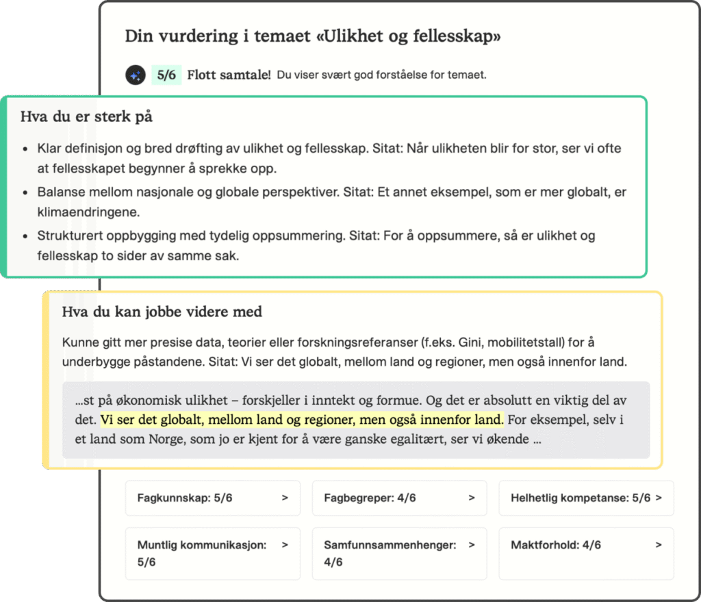 Etter du har avsluttet en muntlige eksamen med vår AI-sensor, får du konkrete tilbakemeldinger med sitater av hva du har sagt, slik at du vet nøyaktig hva du kan jobbe med videre for å bli enda bedre.