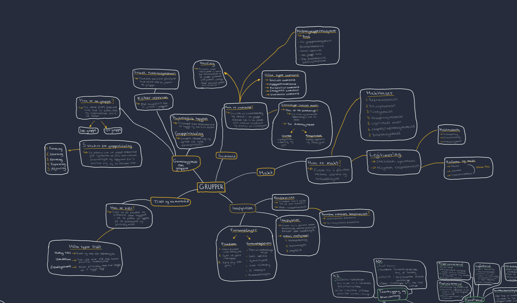 I flere av kursene våre bruker vi tankekart som en ekstra ressurs. Tankekart hjelper deg å organisere stoffet visuelt, se sammenhenger og finne logiske koblinger mellom ulike temaer. Det gjør det lettere å forstå helheten, repetere effektivt og oppdage hull i egen kunnskap. Enten du forbereder deg til eksamen eller ønsker bedre overblikk mens du lærer, vil tankekart være verdifulle – de forsterker læring, hukommelse og konsentrasjon.